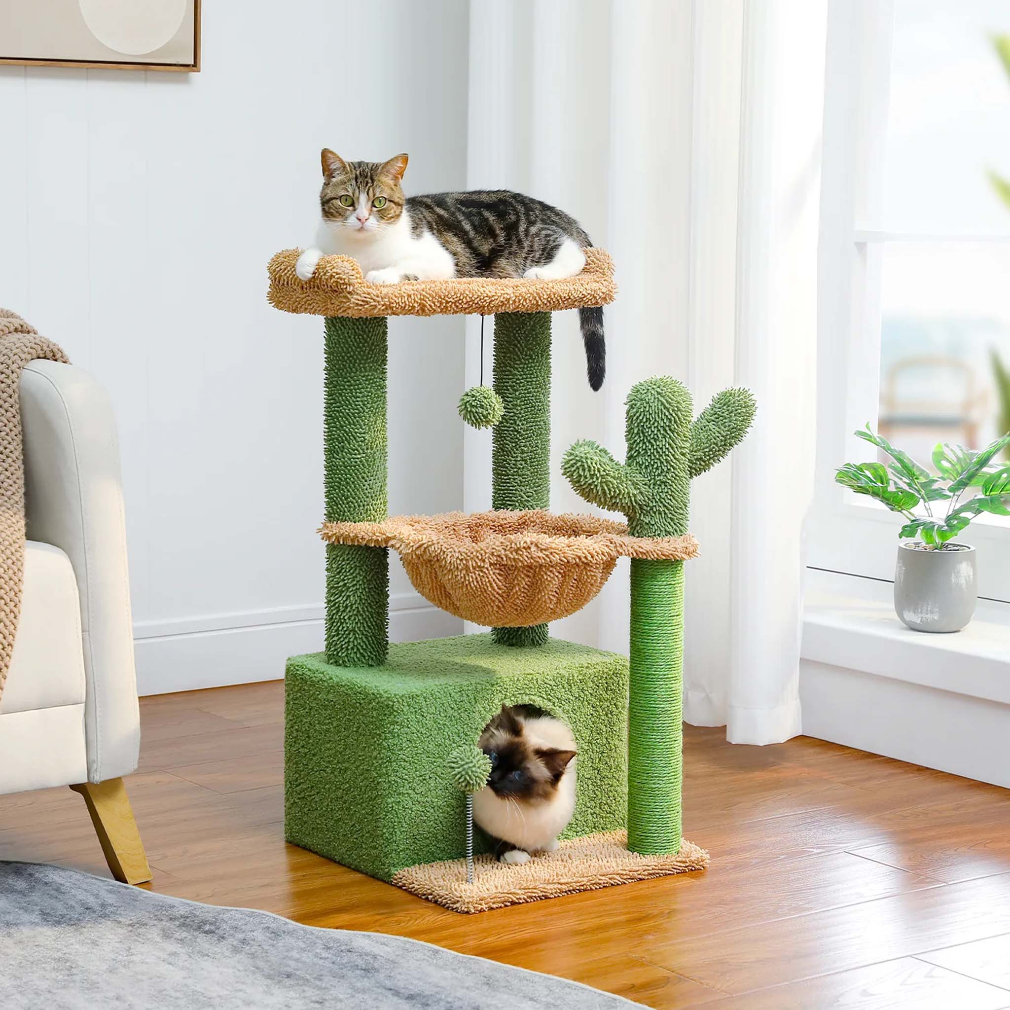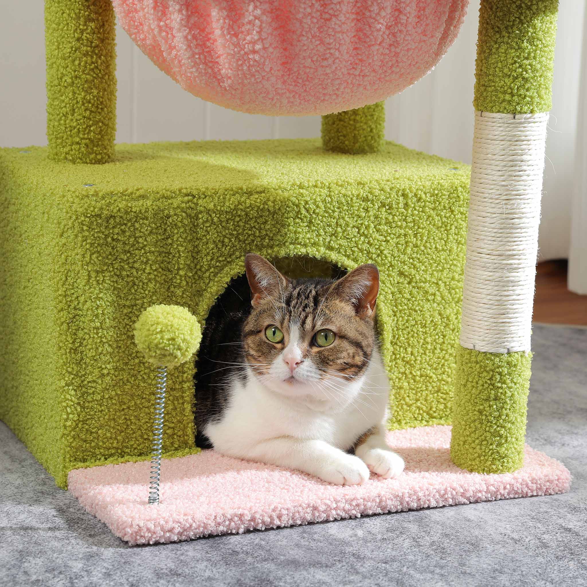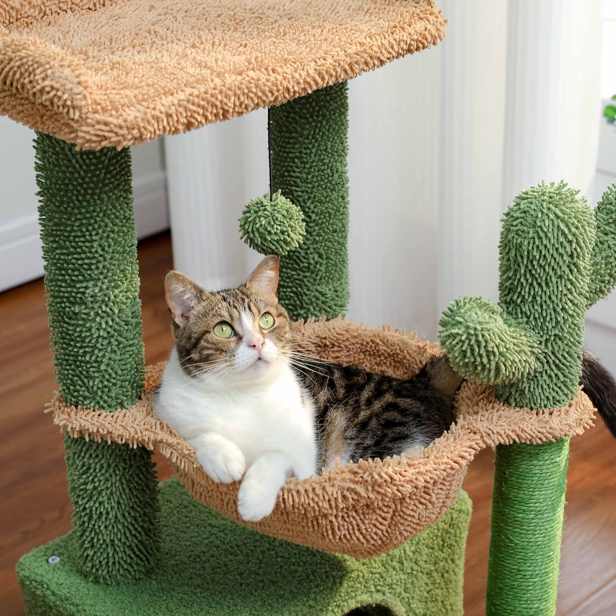 Katten houden van keuze en de CrazyCactus biedt precies dat. Een verhoogd platform zorgt voor de ideale uitkijkplek voor nieuwsgierige katten. Lager bevindt zich een zachte pluche ligplek die uitnodigt tot ontspanning, terwijl het afgesloten kattenhuisje een rustige schuilplek biedt voor katten die graag ongestoord slapen.