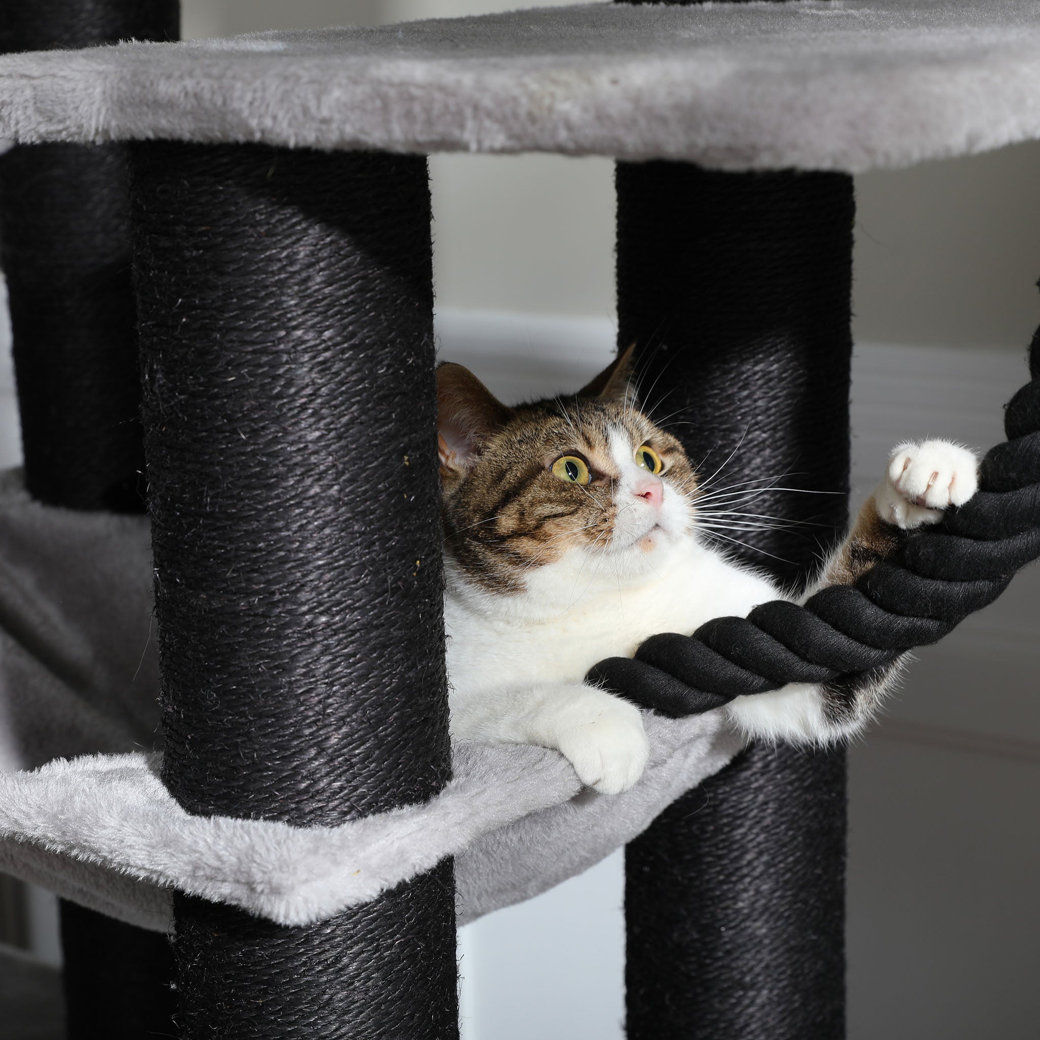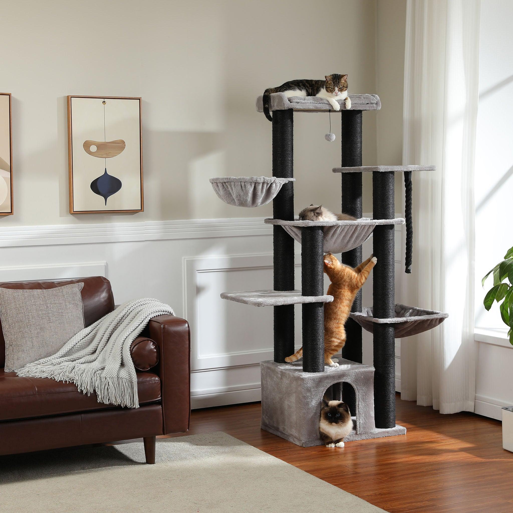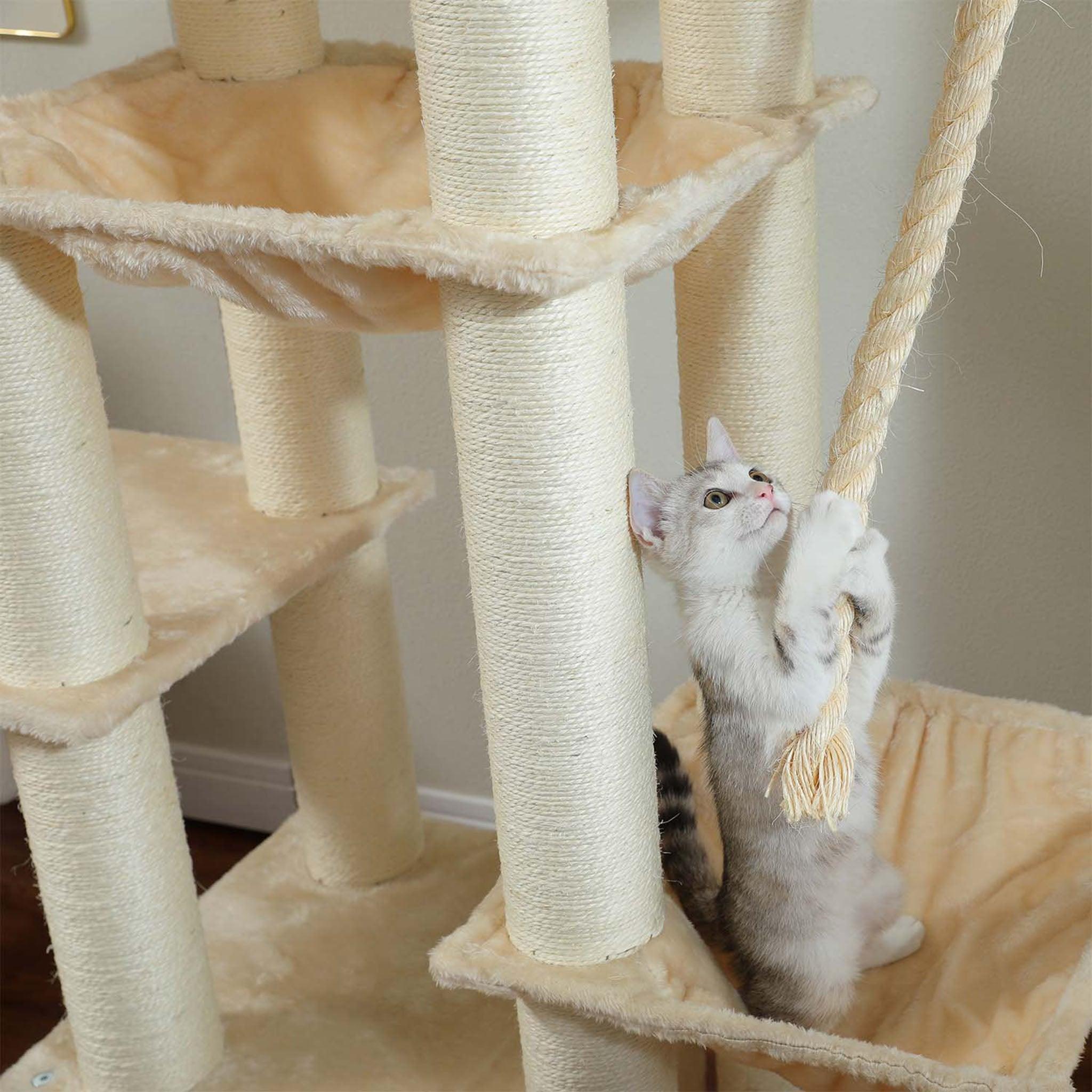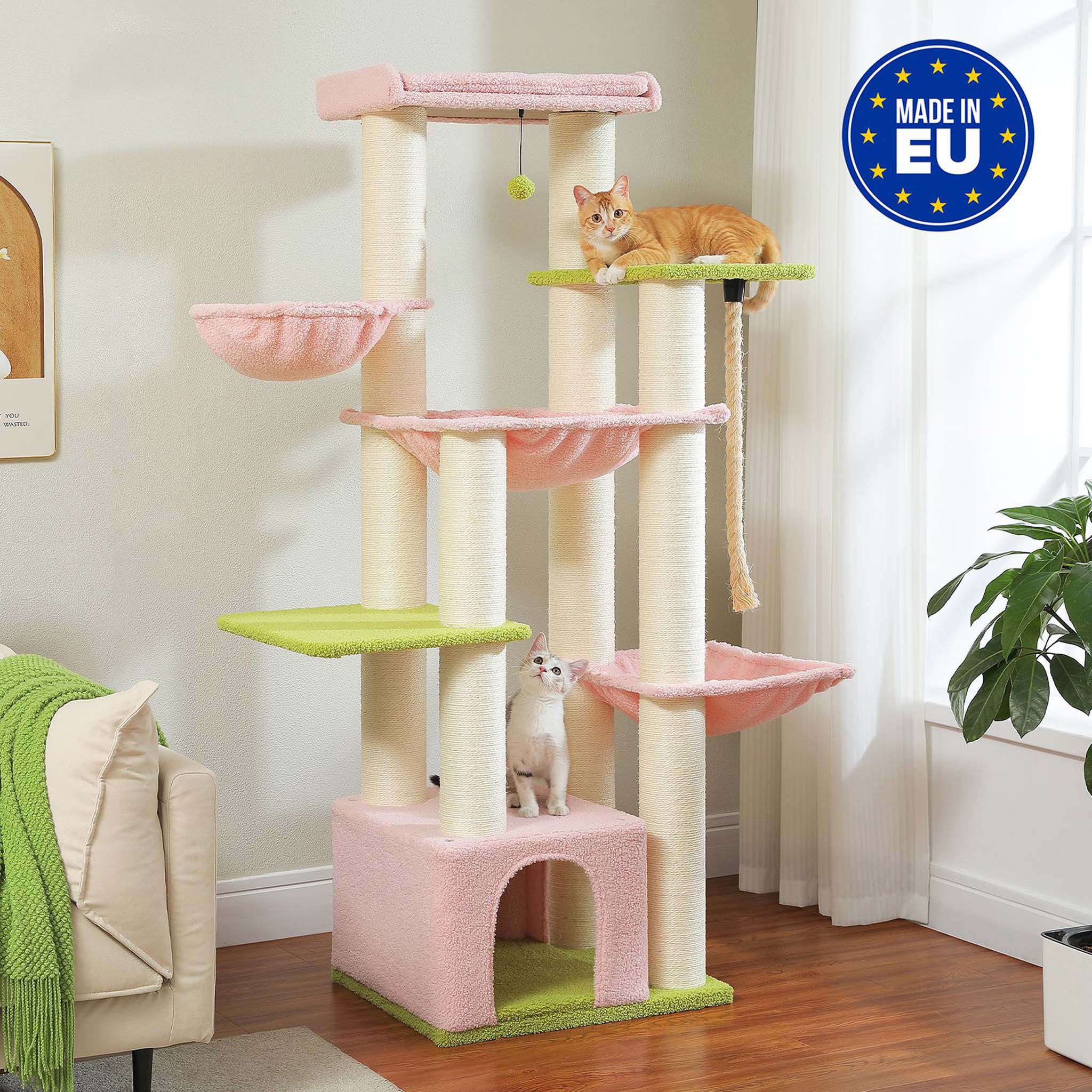 De KittyKingdom is ontworpen met extra brede krabpalen van 11 cm, omwikkeld met duurzaam sisal voor maximale stabiliteit. De grote krabpaal heeft een groot kattenhuis, meerdere ligplekken en verstevigde krabpalen die zelfs grote rassen zoals Maine Coons aankunnen. Gemaakt voor kracht en ruimte is de KittyKingdom perfect voor huishoudens met meerdere katten. Er is genoeg plek voor wel 8 katten om samen te klimmen, slapen en spelen, terwijl je meubels beschermd blijven tegen krassen.