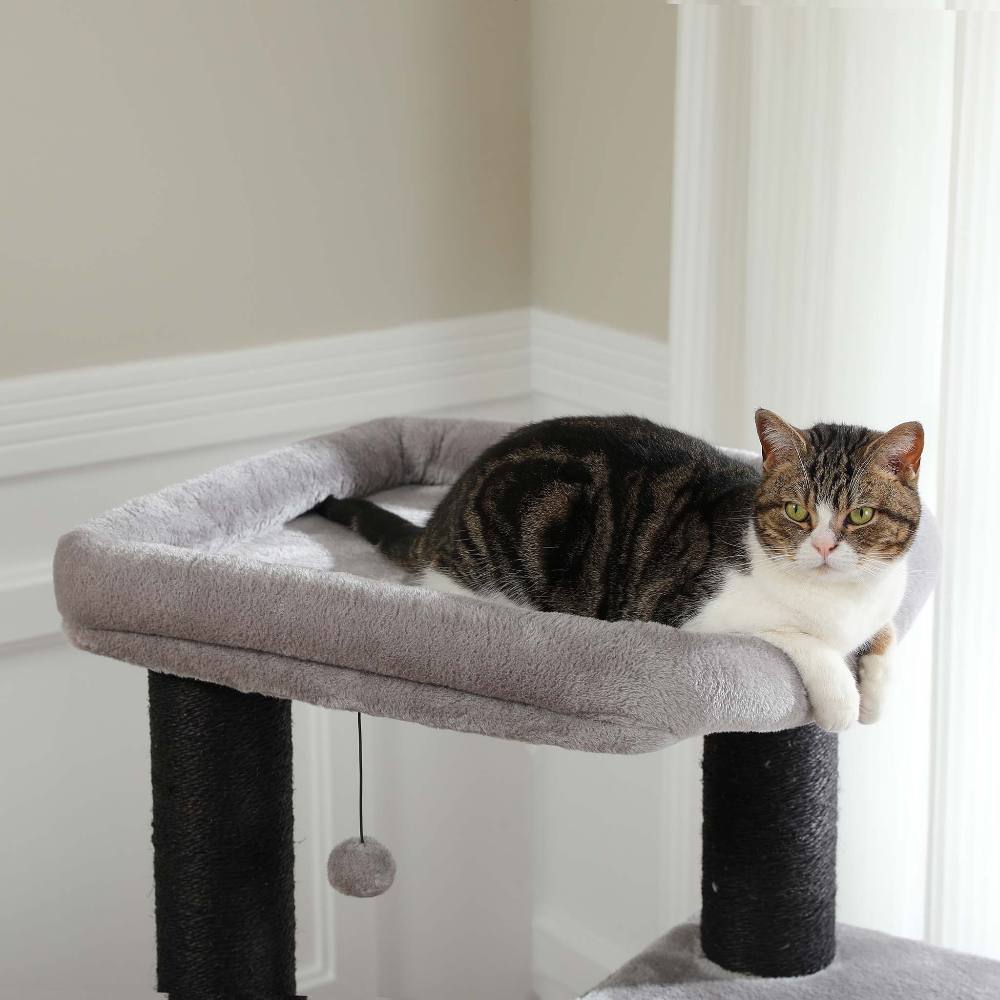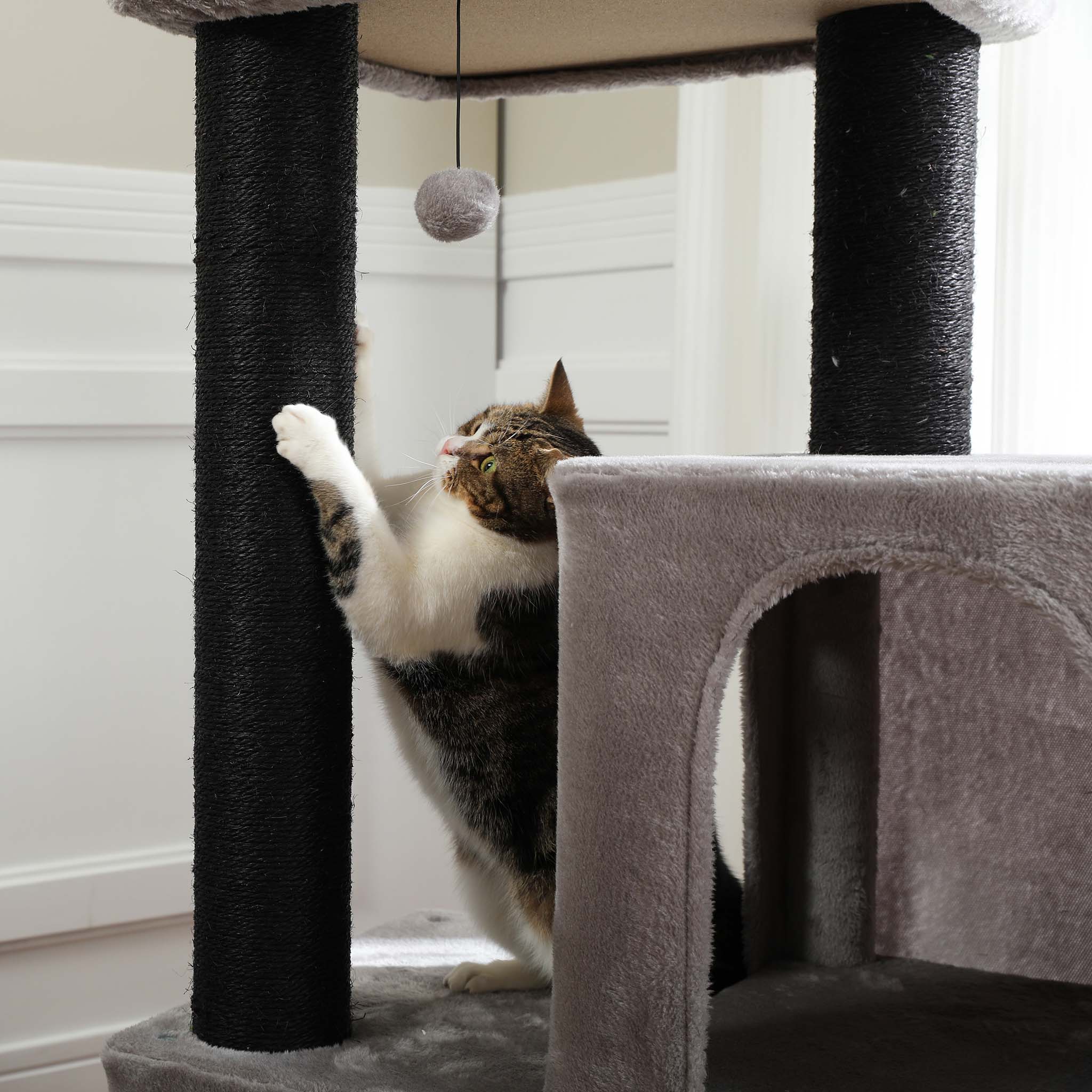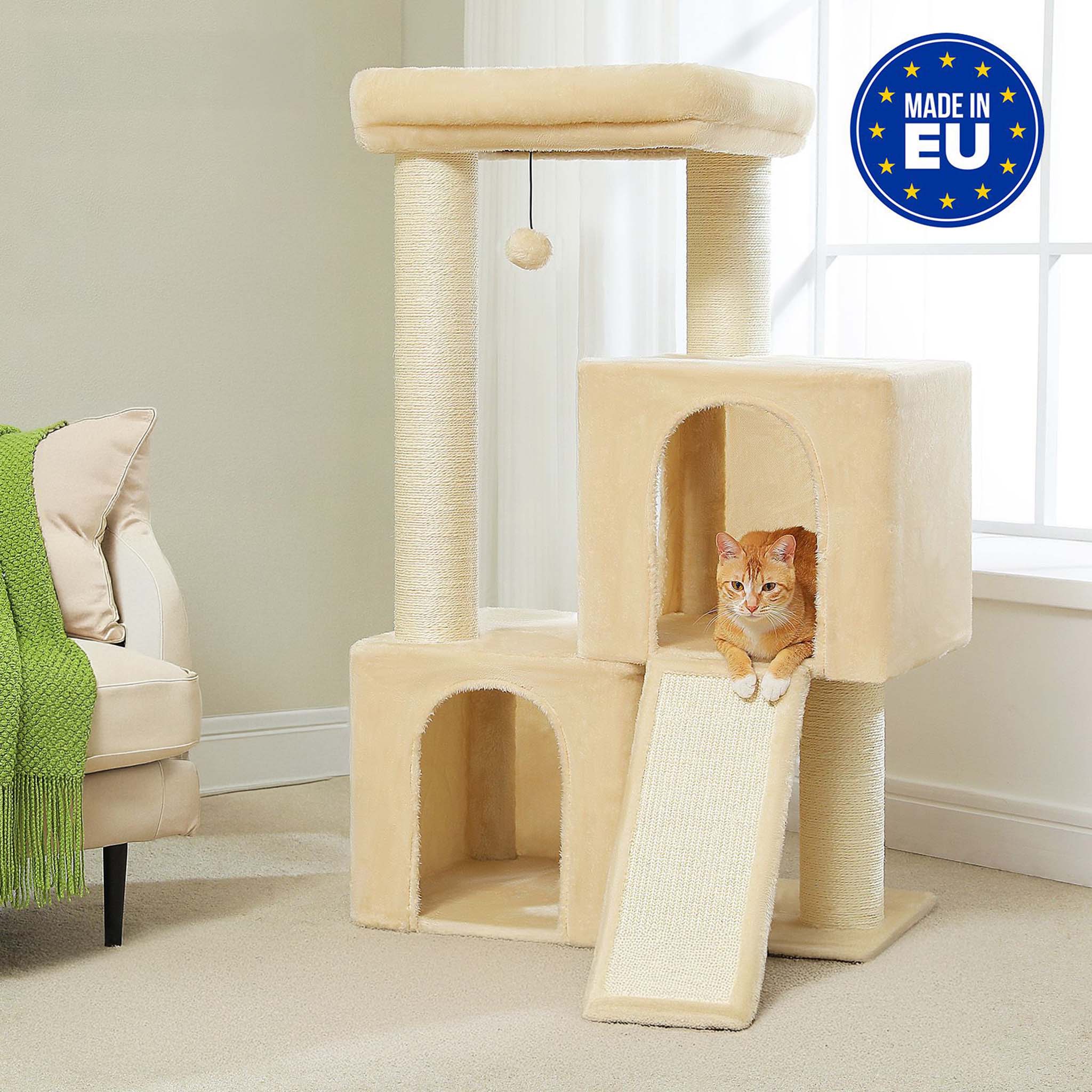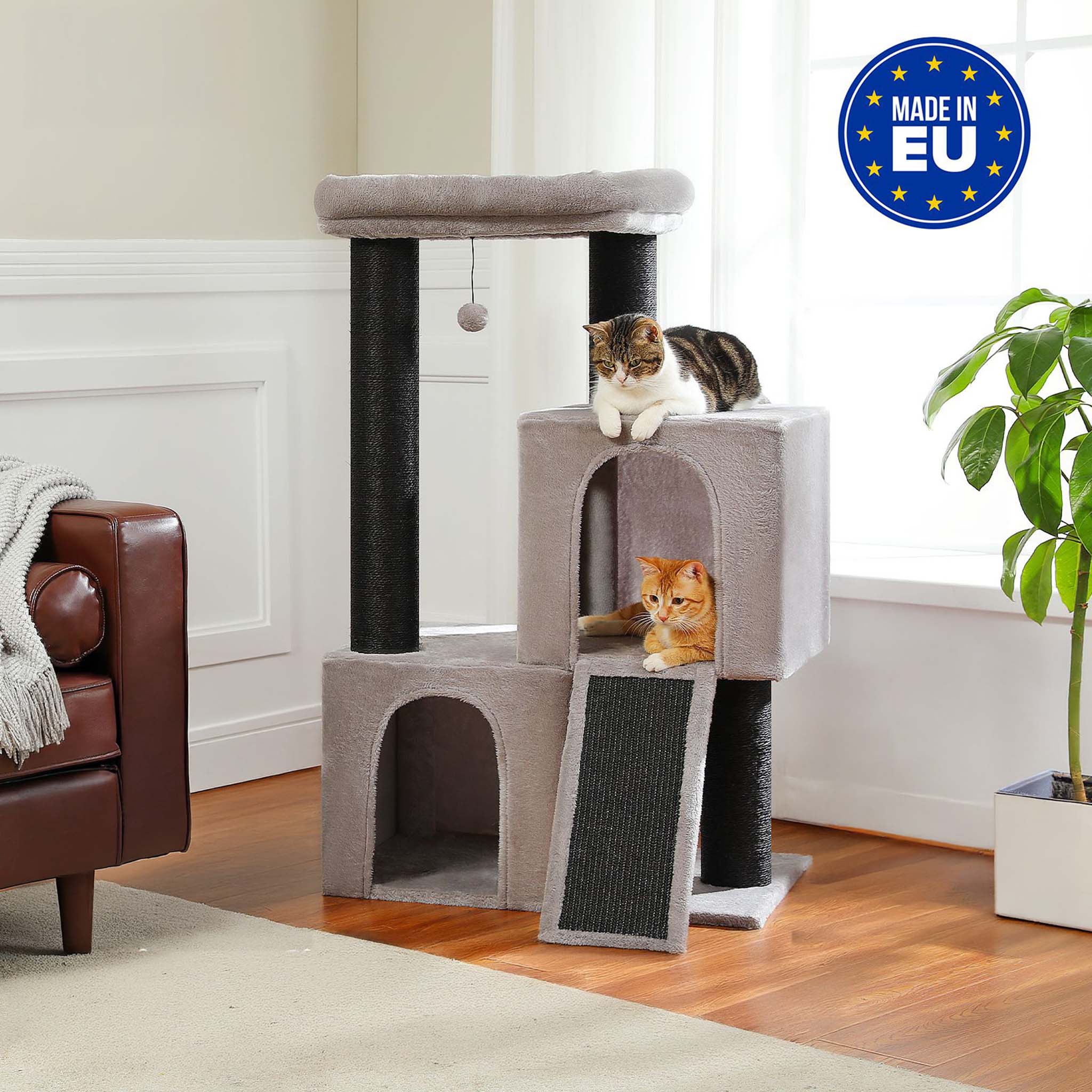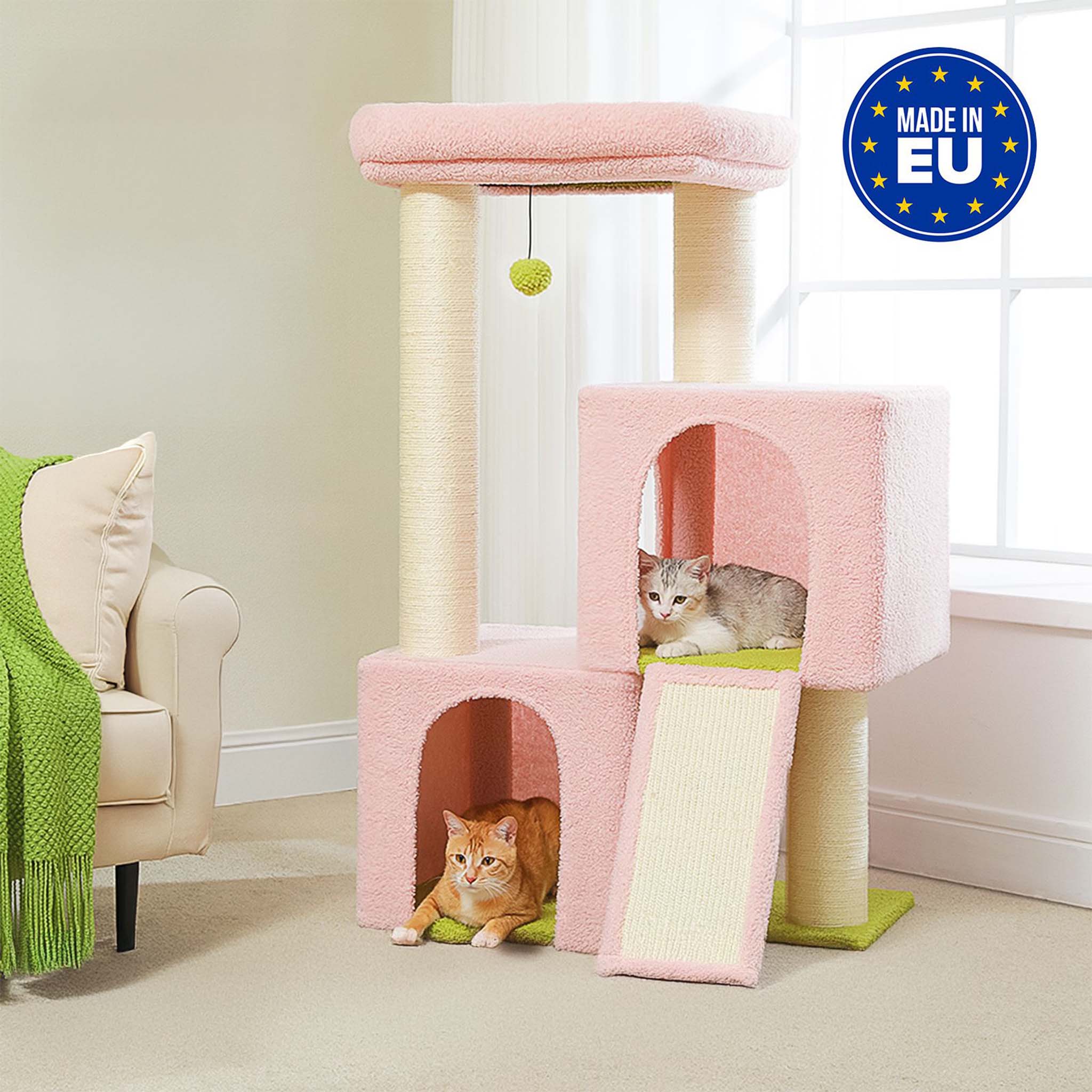 De KittyPalace combineert een tijdloos design met twee ruime kattenhuisjes (40 x 40 x 38 cm) en een groot bovenbed (50 x 50 cm). Perfect voor volwassen katten die houden van comfort en extra ruimte om te ontspannen, klimmen en slapen. De stevige constructie zorgt voor stabiliteit, zelfs wanneer meerdere katten tegelijk klimmen, springen en spelen. Met dikke krabpalen, knusse huisjes, een ladder met geïntegreerde krabramp, vervangbare speelballetjes en een ruim bovenplateau biedt de KittyPalace eindeloze mogelijkheden voor spel en ontspanning. Het bovenbed is bovendien voorzien van een afneembare, met de hand wasbare hoes voor eenvoudig onderhoud.