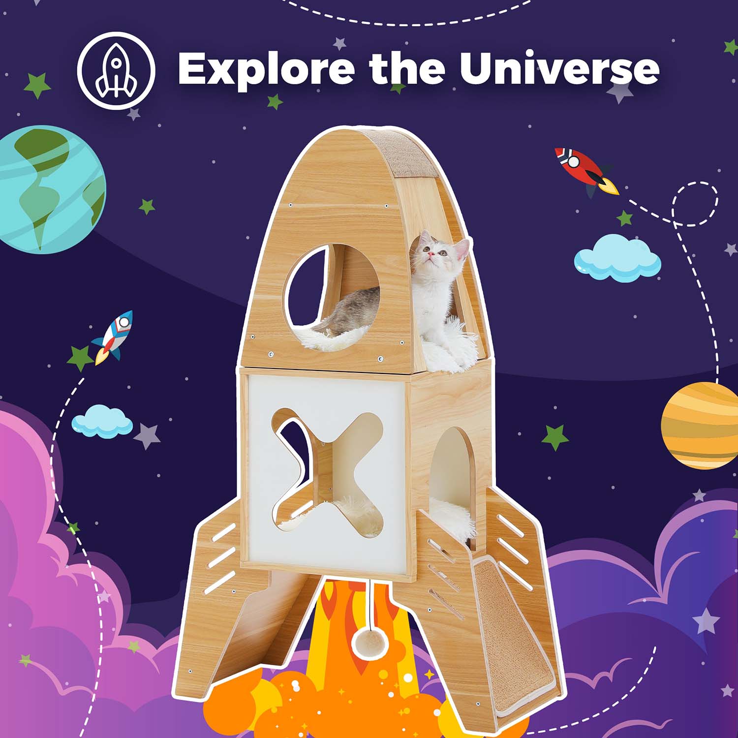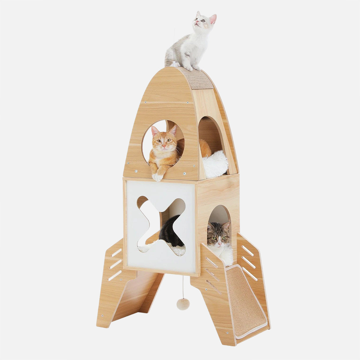 De raket houten krabpaal combineert creativiteit en functionaliteit en geeft je interieur een moderne uitstraling, terwijl het je katten een eigen speelruimte met een ruimtethema biedt.
